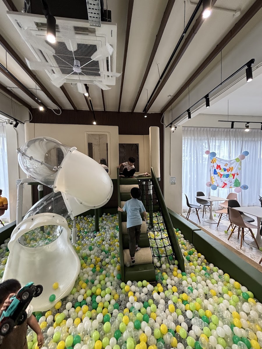 Step inside, and you’ll be greeted by a cozy and inviting atmosphere, perfect for creating joyful memories. The café seamlessly blends a vibrant play area with a comfortable dining space, ensuring that parents can sip their delicious coffee while their little ones enjoy a playful adventure. The indoor playground features a spacious ball pit, a fun slide, and a selection of toys that keep the little ones engaged and safe as they explore.